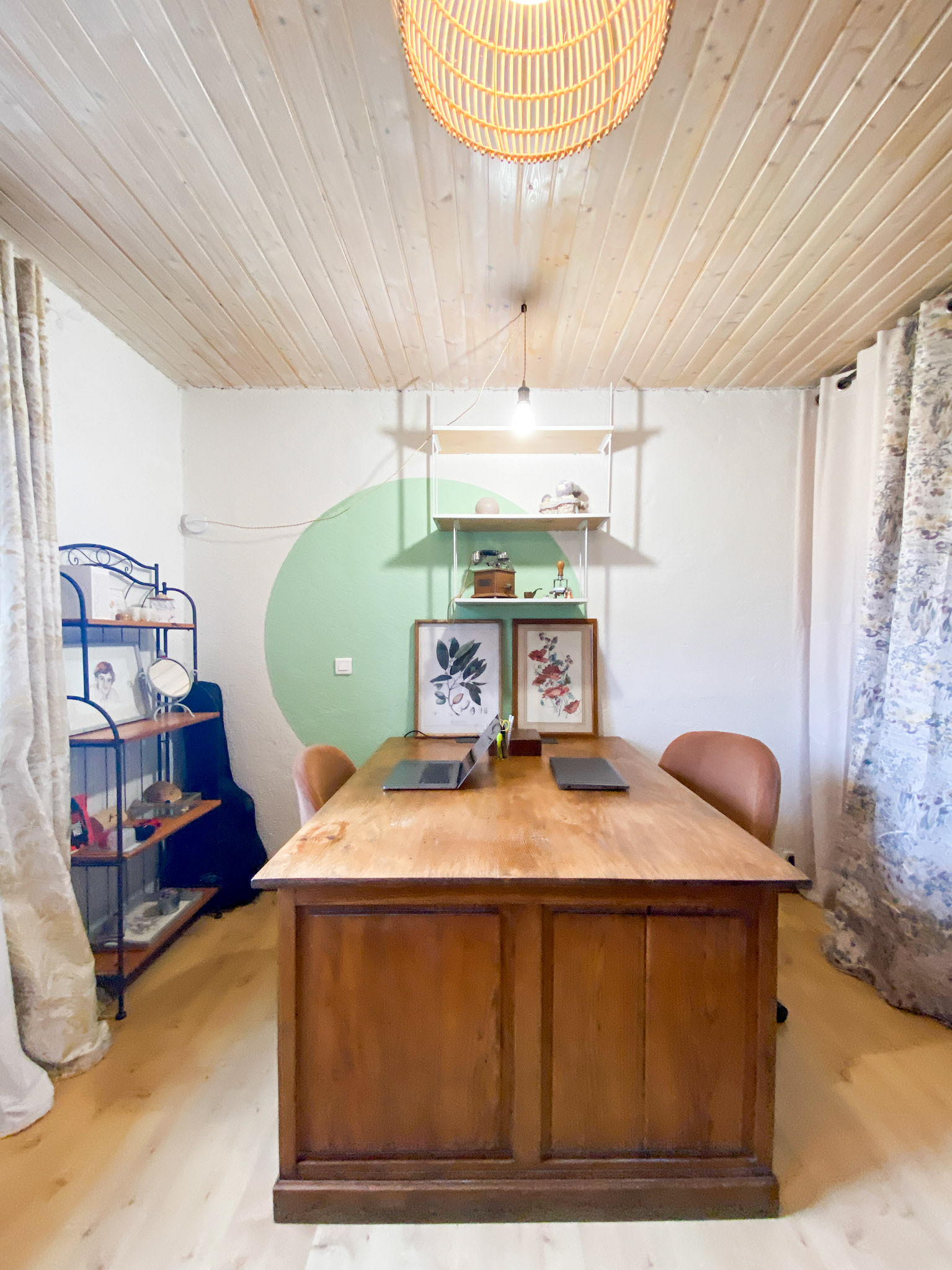Aménagement intérieur d'une maison de campagne pour un séjour et deux pièces de bureaux. S'ouvrir sur la vue et la lumière, créer des ambiances chaleureuses avec des matières naturelles et design d'un bureau d'angle.